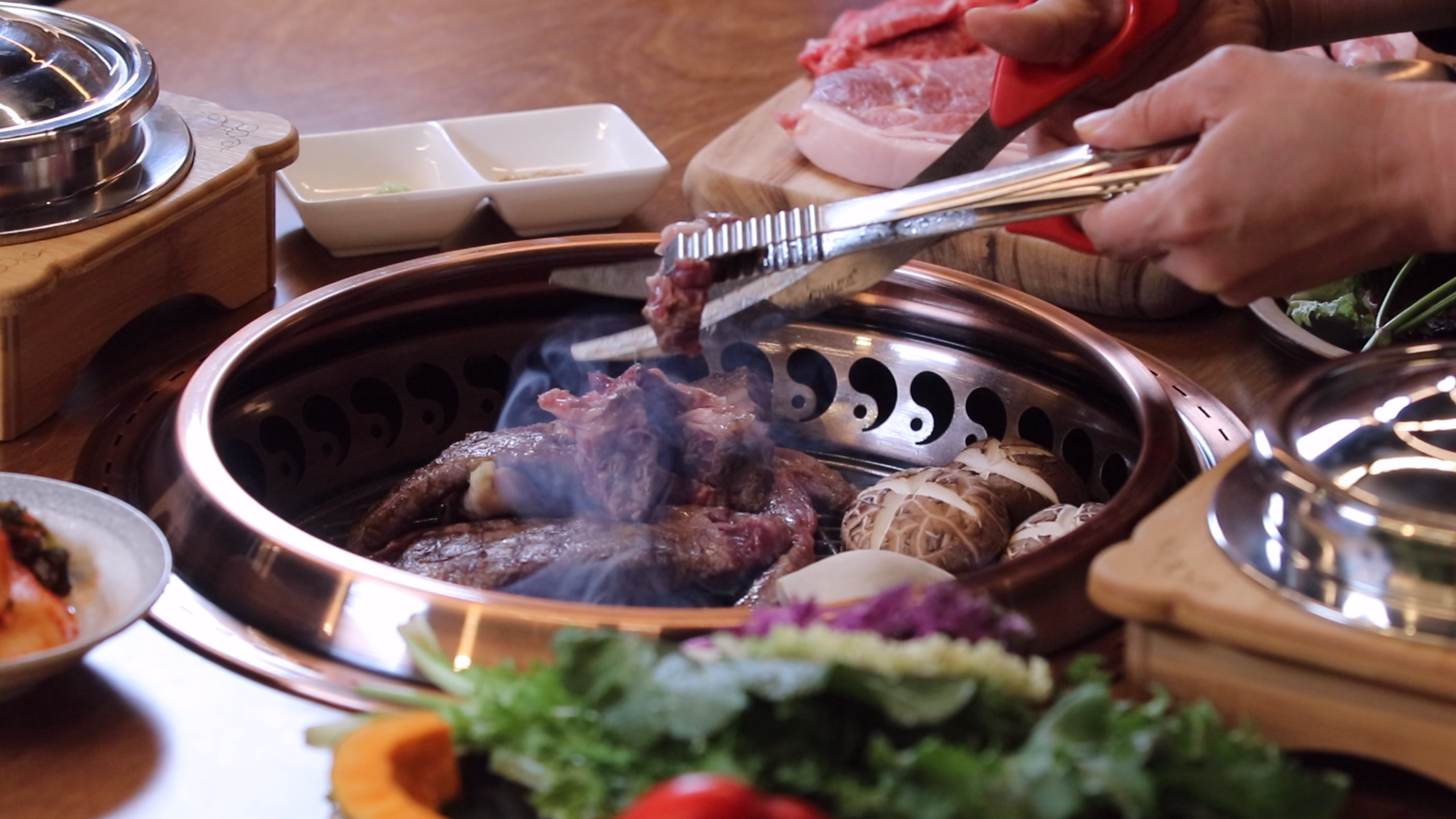 In a pleasant indoor atmosphere, far-infrared radiant heat to grill meat deliciously, capturing smoke and odor with a downward airflow structure, allowing for an elegant and sophisticated ambiance.